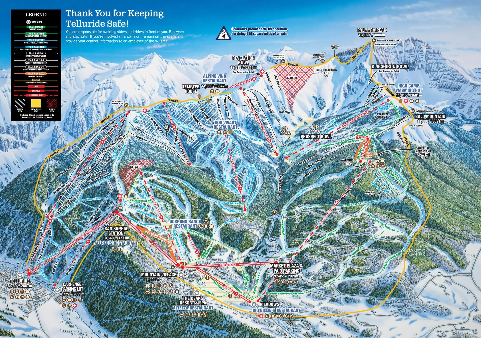 Telluride Ski Resort Map (Source: Telluride Ski and Golf). Bear Creek basin is behind the highest ridge (access points are marked); Alta Lakes off piste area is top right, and Ophir Valley is further to the south behind that. Highly detailed Telluride Off-Piste aerial photos can be found here.